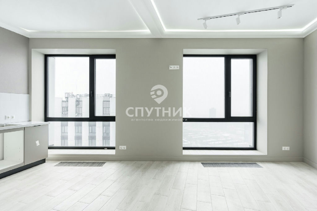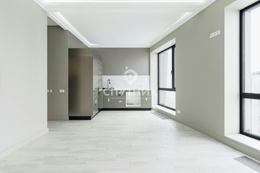-Планировка: самое ценное в студии два панорамных окна, которые разбивают пространство на две равные, но разные по настроению части, есть возможность отделить кухню от спальни. Большой совмещенный санузел. Просторная гардеробная комната. Высокие потолки. Установлена компактная и стильная кухня.